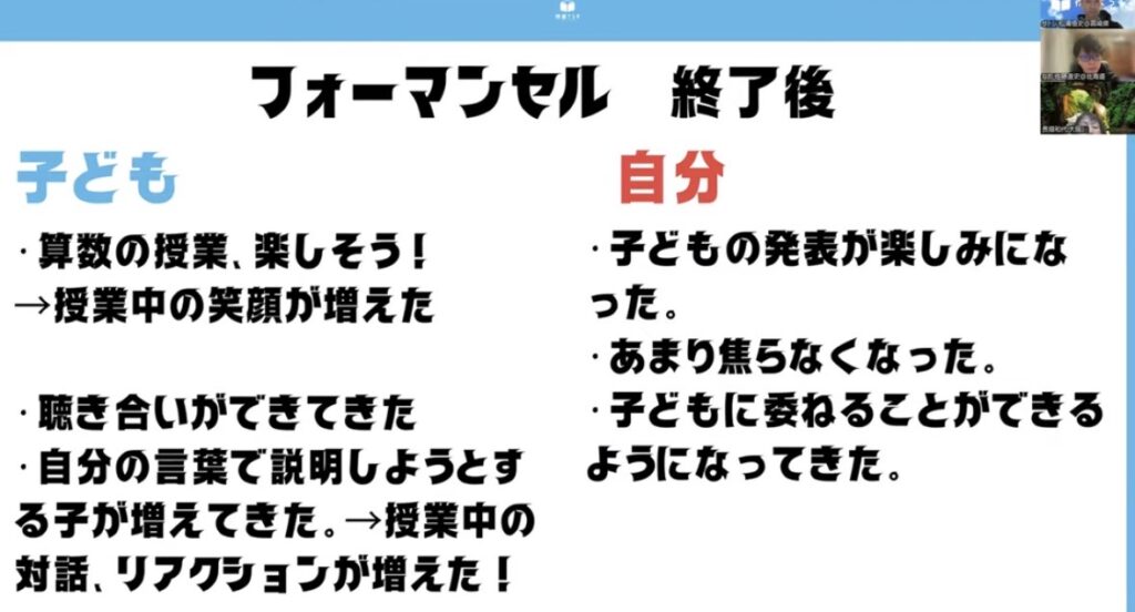 フォーマンセルは、自分の授業を見てもらうだけでなく、他の参加者の授業を見て学ぶことができるのも、このフォーマンセルの魅力だと思います。学年が違ったり、同じ学年でも教科書が違ったりすると、また授業が変わってくるので、引き出しを増やすことができます!入って損はないです!