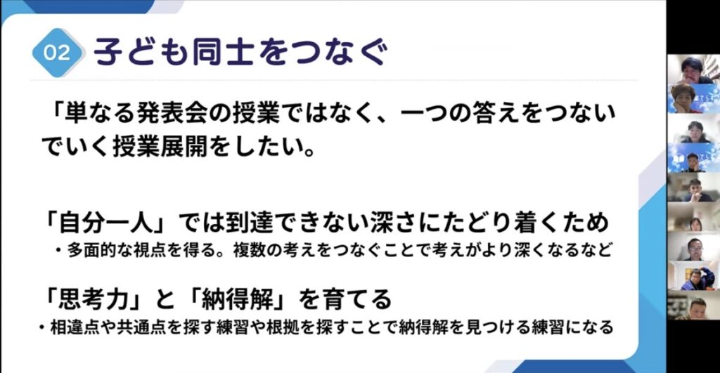 これまでは、ある子の発言に対して教師が「次は〇〇さん、どう思う?」と、別の視点へパスを出してしまいがちでした。今回はそこを意識的に変え、一つの意見をクラス全員で吟味する仕掛けを取り入れました。